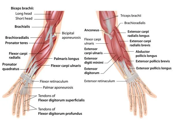 Primary among these are the flexor and extensor muscles, which run from the forearm to the hand.